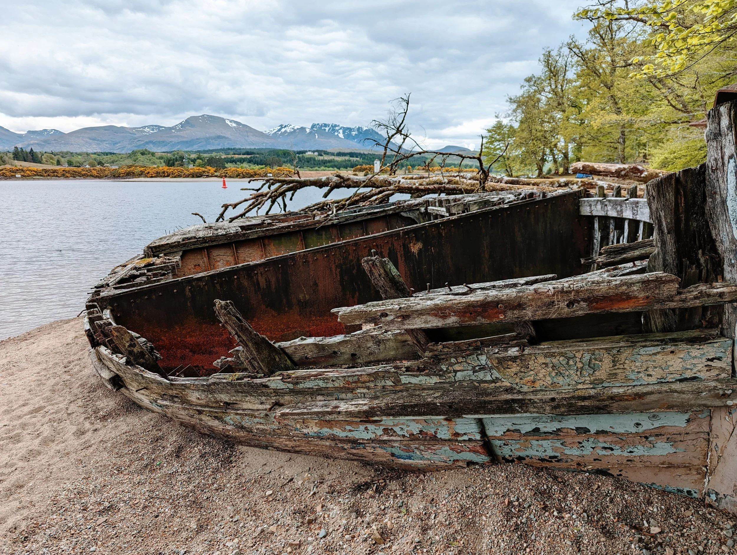 Stage one, from Banavie to Gairlochy, follows the 10 miles on the towpath alongside the Caledonian Canal. On the spring day I set off, it was exceptionally pretty. The sun was out, the air was rich with the scent of sweet pine and coconutty gorse, and bees and butterflies were out in force – an assault on the senses that starkly contrasted the inhospitable wilderness I had come from. After a few hours the towpath became a little monotonous, but it wasn’t long before I reached the wilder, more expansive scenery of Loch Lochy. Almost immediately the path led me to a secluded beach where an enchanting old boat wreckage had made itself a permanent feature, its hull long buried in the sand. The perfect spot for a tea break.